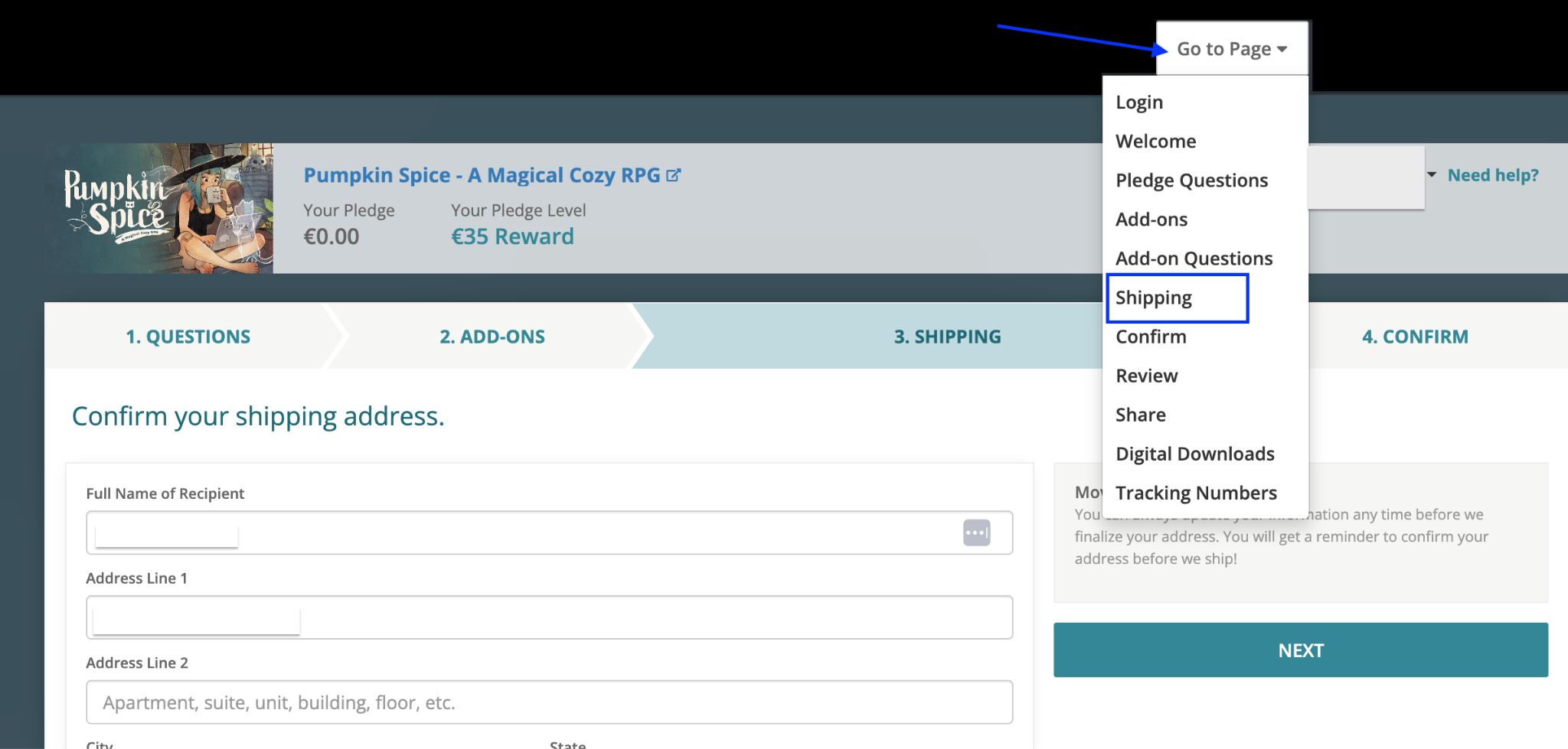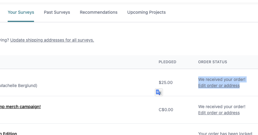 Click Avatar → Your Pledges & Surveys → Your Surveys → “Edit order or address” → “Go to Page” (top-right corner) → "Edit Shipping Info."