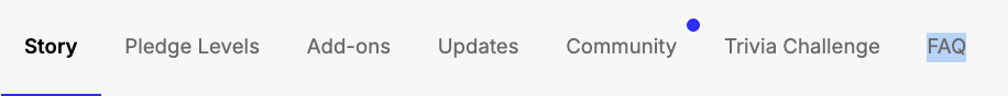 - After locating the campaign, scroll down on the project page and click the FAQ tab (grey banner, last tab) located below the project banner and funding goal. (example)
