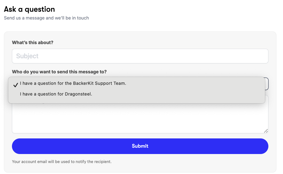 - After this, be sure to choose whether you'd like to reach out to the project team directly (fulfillment questions, shipping cost estimates/timelines, product questions, etc) or the BackerKit Support Team (survey questions, failed charges, account issues, pledging information, general BackerKit questions). We will not receive a copy of inquiries sent directly to the project team. Note: If you need to leave a screenshot, you will be able to do this as soon as you hear back from us.