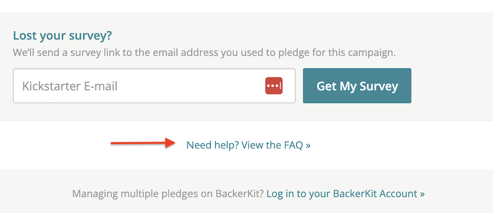 - If you cannot login into your survey, or have only placed a preorder, you will not be able to use the above methods. You can look for your project on the Find your Backer Survey page and click "Need help? View the FAQ" to view the FAQ page for your project. Look for the text box, "Still Have Questions? Contact Us" and fill out the form. NOTE: If you need to update an AppleID email address, please include the updated email in your reach-out, and pledge number.