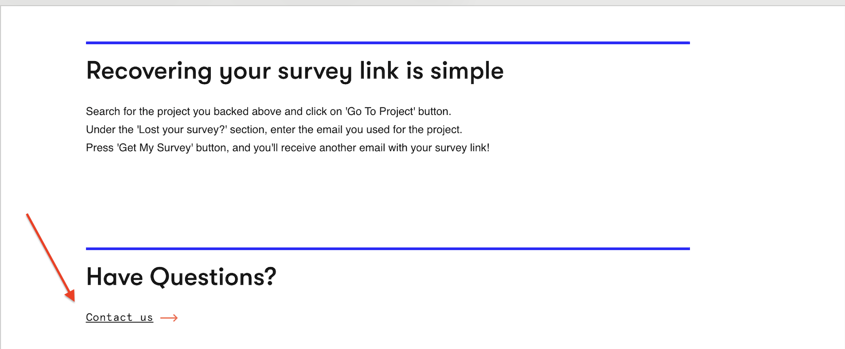 - If you have a question that is unrelated to an existing pledge, project, or survey, you can still contact us via the footer of our For Backers page by scrolling to the bottom and selecting 'Contact us ->" under "Have Questions?" This will open up your email portal so that you can send us an email.