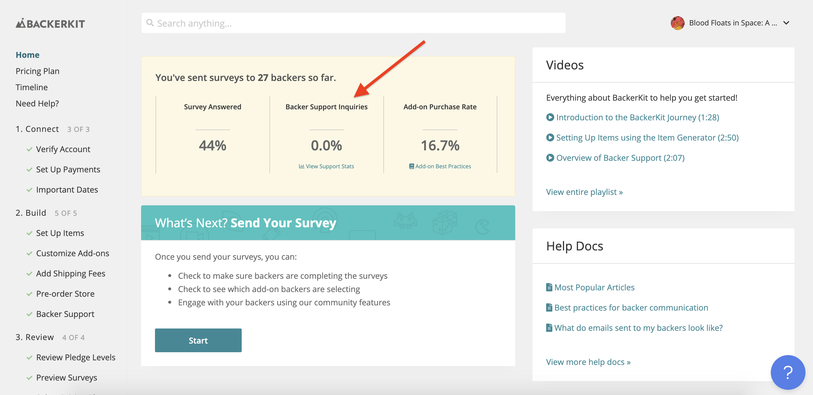 Please note that this dashboard will change once the smoke test is completed and the rest of your surveys are sent. Here is a quick overview of how you will be managing your backers in BackerKit after sending the smoke test: https://help.backerkit.com/article/593-ive-sent-out-my-surveys-now-what