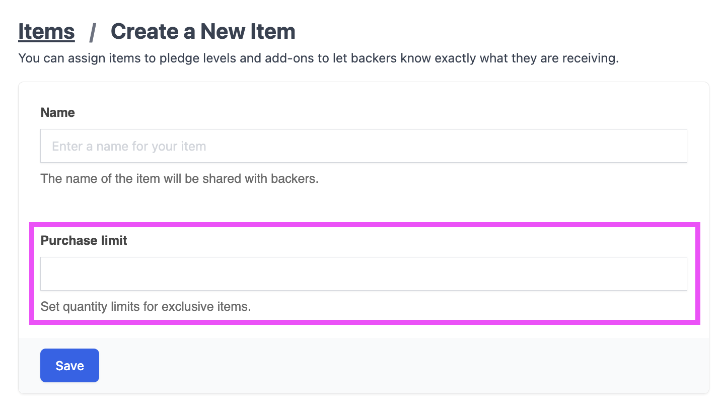 If you have limit stock of an item, or would like to offer only a set amount, you can apply a Purchase Limit directly to the item. If the item is assigned to a pledge level, add-on, or both, as soon as the Purchase Limit is reached, everything will be marked 'Sold Out!'.