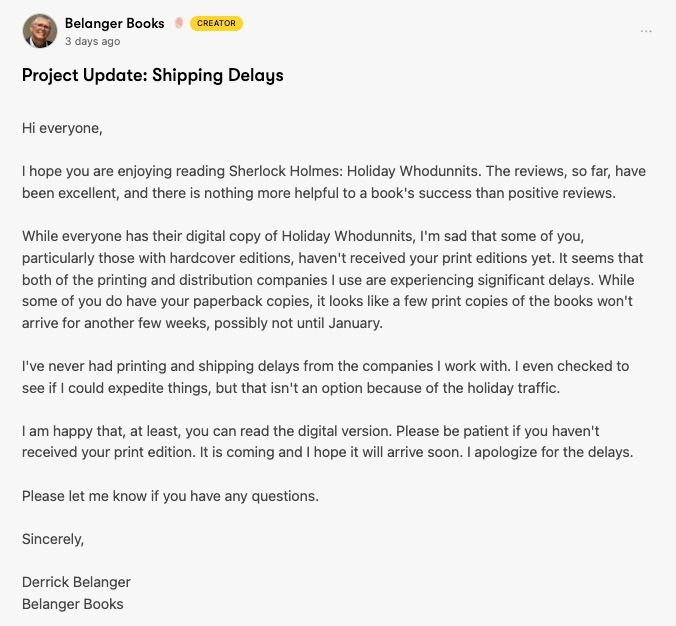“We encountered a delay due to X. We are currently working with our manufacturers and logistics partners to adjust timelines. This does not affect your pledge or shipping fees. Our next update will be posted by [date]. Let us know if you have any questions. Thank you for your patience and understanding.”