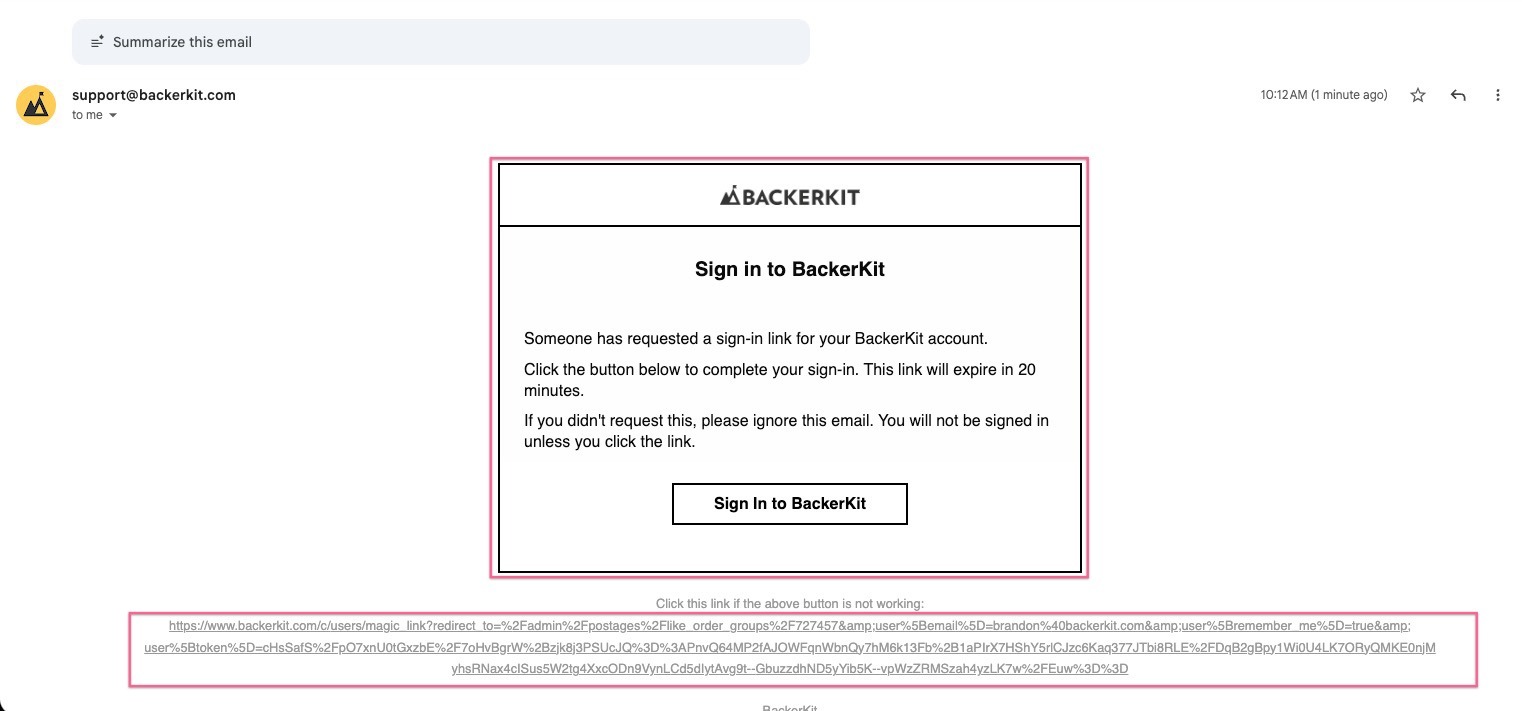 The email address is from “support@backerkit.com but it’s sending from “s.backerkit.com.” Please whitelist both, which allows emails from those addresses.