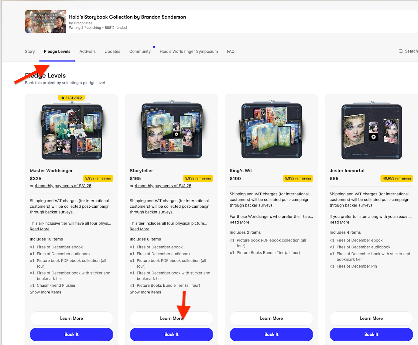 | Pledge level/bundle | The first step to pledge – when backing, you choose your pledge level first. then may add additional items if available. Pledge levels are predetermined and cannot be modified. These control what rewards you'll receive. |