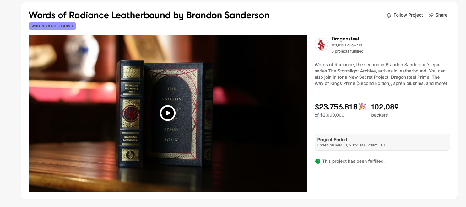 | Incentives (Early Bird, Returning Backer, etc) | Exclusive rewards for backing a project early, often within the first 48-72 hours —such as free or discounted items, or digital content. Returning backer incentives reward previous backers for supporting new projects, often with exclusive items. |